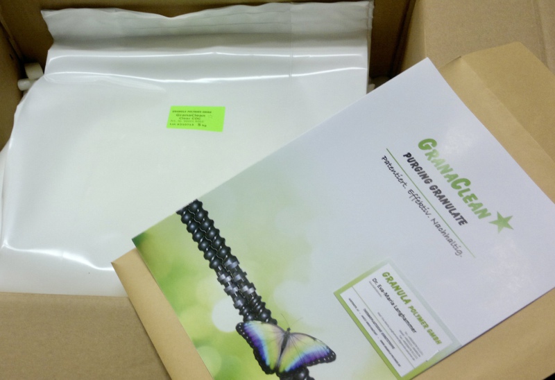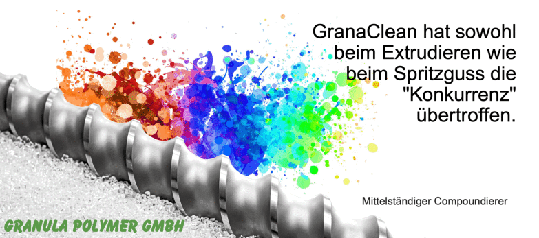 - GranaCleanⓇ ist fertiges Granulat, welches ohne Abmischen direkt eingesetzt werden kann. Zudem können ihre Prozessparameter zum vorherig gefahrenen Material