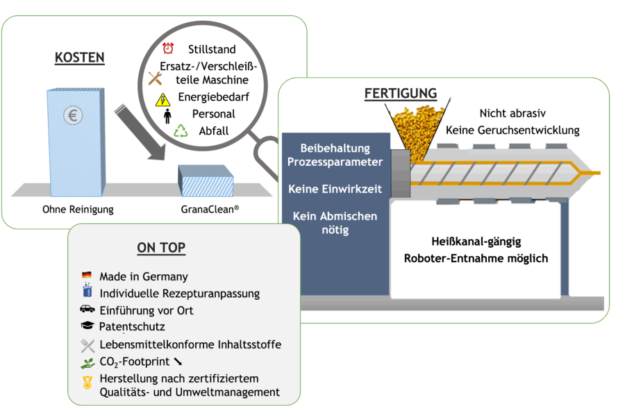 - Sämtliche Inhaltsstoffe von GranaCleanⓇ können auf Wunsch lebensmittelkonform eingestellt werden und sind nicht abrasiv zur Schnecke.